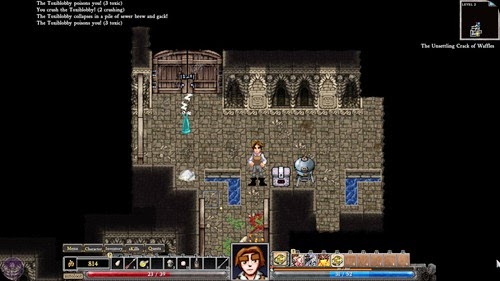 The game world is laid out in a tile-based square grid viewed from a top-down perspective, where the player, enemies, and various items and objects occupy discrete squares. The game is turn-based, and both the player and numerous enemies take turns performing actions. Each turn the player may move to or attack monsters in adjacent squares, pick up, drop, and use items, and interact with various in-game objects.